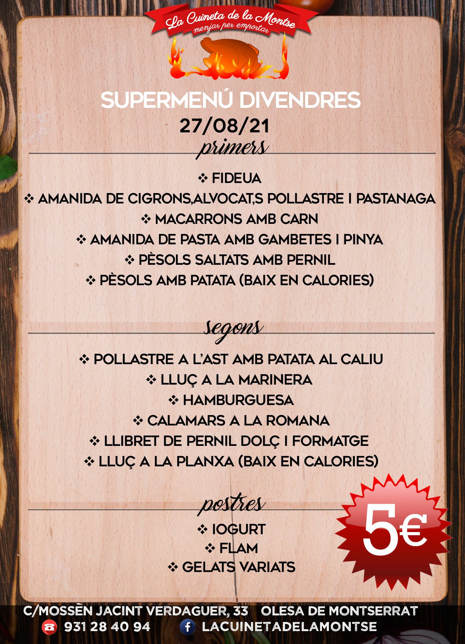 A La Cuineta de la Montse creiem que menjar bé no té per què resultar car, per això elaborem diàriament propostes a preus molt populars. A més, de dimecres a divendres t’oferim un descompte especial portant un primer i un segon plat: descobreix els nostres menús!