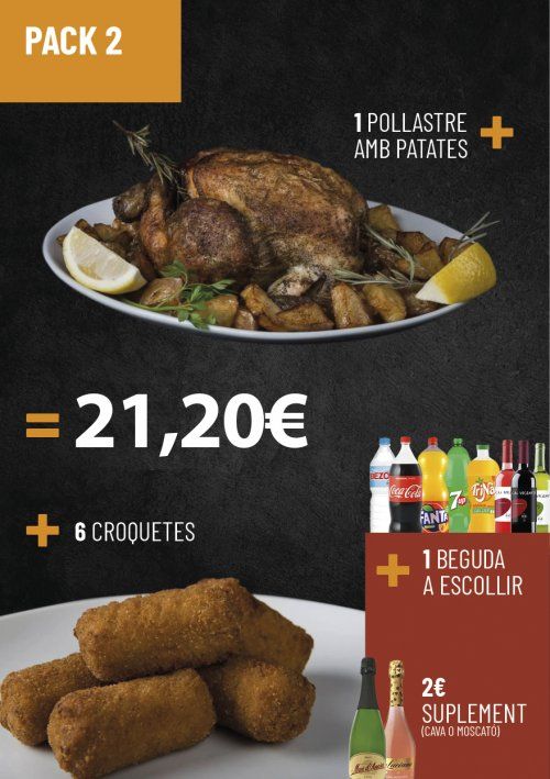 Pack 2: pollastre amb patates al caliu + croquetes + beguda